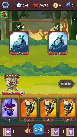 进入战斗界面,可以看到敌人卡牌头顶特殊标识,意味着敌人将进攻,造成四点伤害。屏幕的最下方的2/3,代表每回合出三张牌,还剩两次出牌机会,我们可以继续使用护甲叠加护甲,也可以直接进攻。