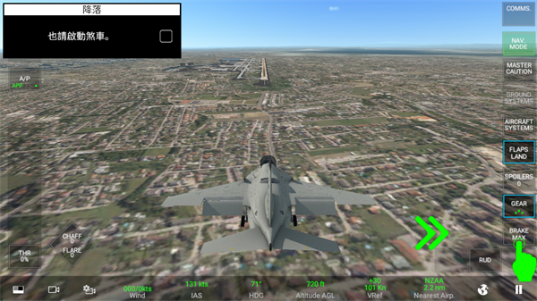 6、最后点击屏幕右下角的“BRAKEMAX”,将发动机关闭,降低飞机的飞行速度,再缓慢调整飞机角度,对准跑道。