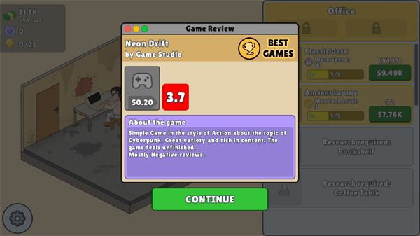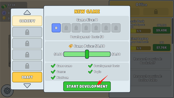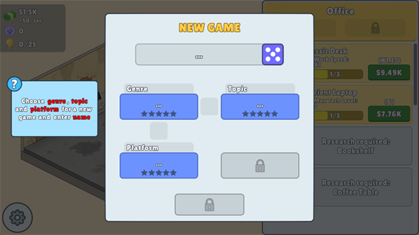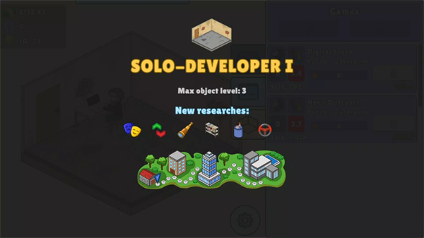 新手教程简单易懂,开局设置角色后,先买基础设施再开发游戏。开发过程中,你需要平衡价格和时间,等待游戏完成后再看看销量和收益。最近的更新修复了研究系统,部分研究可以直接解锁,这让流程更顺畅。