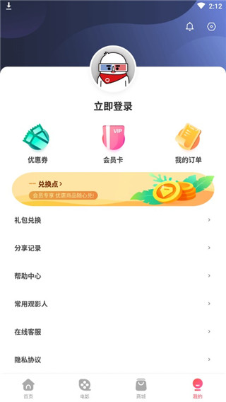 5、点击我的,可以登录app,领取优惠券,查看自己购买了哪些影院的vip