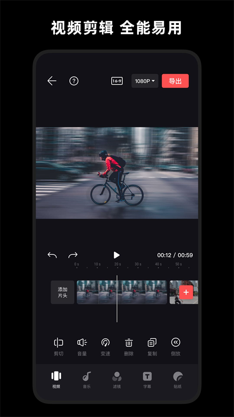支持视频剪辑、拼接合并、裁剪分割、倍速慢放、倒放、音频剪辑等多种功能,而电影胶片级滤镜、调色、丰富有趣的动态贴纸和字幕、转场特效以及高清导出,让你的视频更“完美”。
