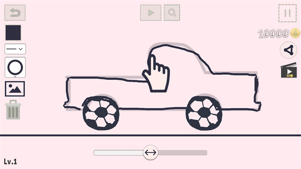 1、我们先简单的了解一下游戏的规则,游戏设置一个起点和一个终点,中途的路线是通过自己的想法绘制出来,起点处有默认有连个轮子,需要您绘制汽车外形,绘画完成点击开始按钮即可开始游戏。