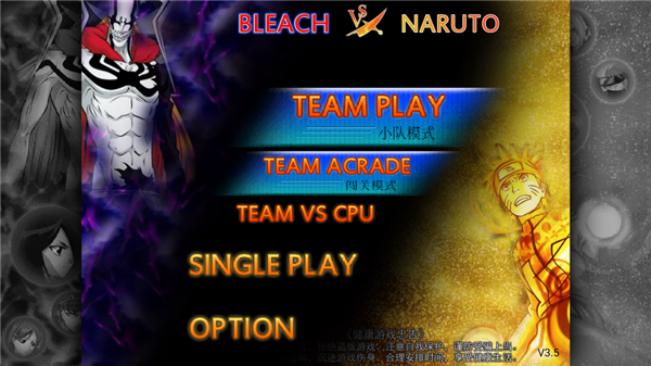1、进入死神VS火影绊175人版,选择游戏模式进入,有小队闯关、单人闯关、对战电脑模式。