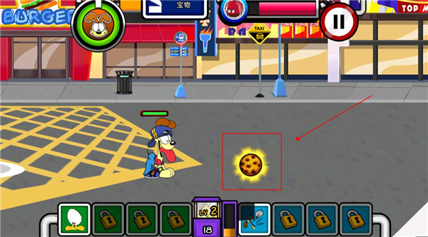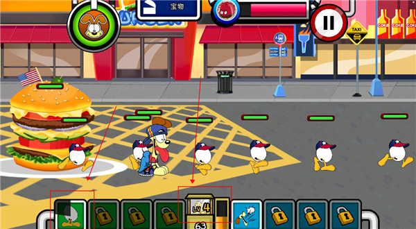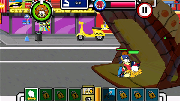 游戏的操作跟暴力板儿砖类似,玩家点击屏幕左右即可控制加菲猫的移动,点击相应的技能图标即可进行召唤伙伴、释放技能、升级等级等功能操作,玩家根据自己的策略合理分配即可。