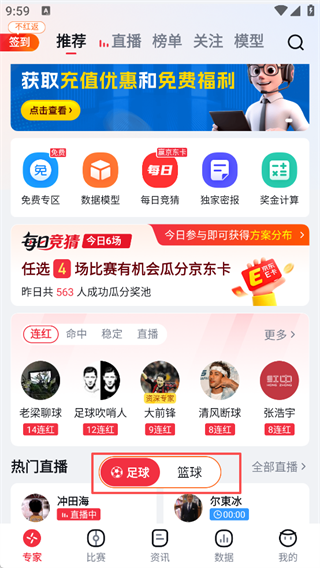 1、打开球讯App,在专家板块,你可以选择【足球、篮球】查看热门直播