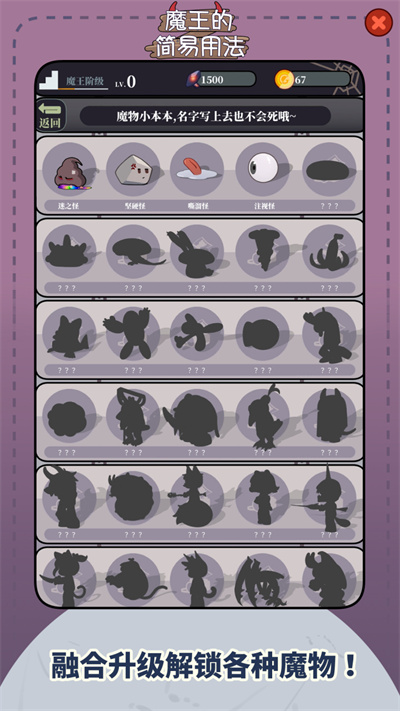 魔王的简易用法是一款趣味十足的休闲娱乐游戏,画风简洁,呆萌的同时又不失趣味。该游戏主打的是放置挂机以及合成玩法,玩家们的每一个怪兽都可以进行合成,但合成都需要一定的合成数量,所以我们要先收集一定数量的怪兽进行合成,只有合成出强大的怪兽之后才能够拥有打败人类的力量,顺利的完成各种关卡的挑战。玩家还可以在商城当中使用金币来购买重要的道具,道具可以帮助你在闯关时遇到难题的时候使用,然后我们通过不断的击杀怪物获得奖励和资源,解锁更多的角色和关卡。