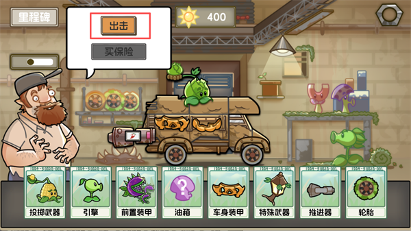 3、确认改装后,点击【出击】进入关卡。你也可以选择提前【购买保险】,在对局中获取更多阳光,为战斗增添优势。