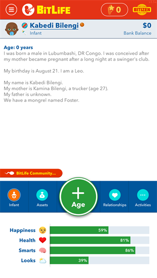 进去后会随机性别/国籍/家境/各种数据,然后就开始按年龄加一的按钮,随着年龄增长逐渐可以做更多的事情。