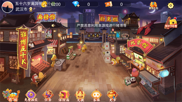 主界面有麻将馆、扑克馆、比赛馆等不同场馆,可根据喜好选择进入,同时底部有商城、免费抽奖等功能入口。