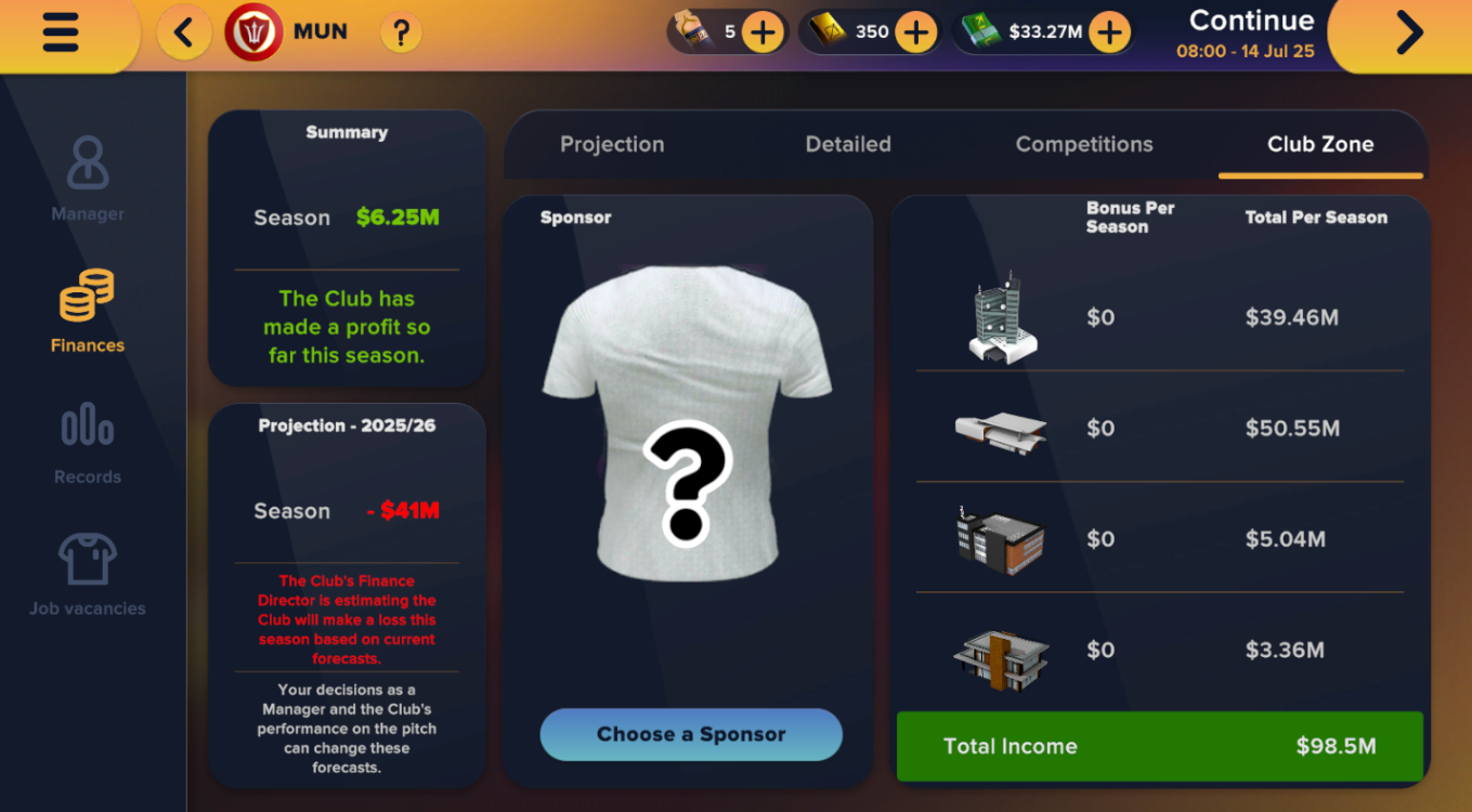 2、财务控制与战术同样重要。工资或转会支出过度会导致亏损,这可能会让董事会不满。财务面板会分解门票收入、商业收入、奖金和支出。始终检查赛季预测——如果显示亏损,你需要调整支出或签下更强的赞助商。在俱乐部区域选择合适的赞助商可以显著提高你的年收入。