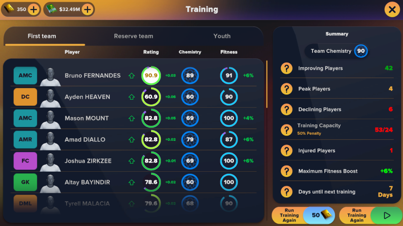 8、训练可以提高球员的评分、化学反应和体能,但必须仔细管理。要专注于那些成长箭头高、像Ayden Heaven这样的年轻球员,他们受益最大。老将如果过度训练,可能收益不大,还容易受伤。不要超过训练能力,如红色罚分所示,因为这会降低效率。在训练中轮换球员,以在球队中分散好处,同时避免个人负担过重。
