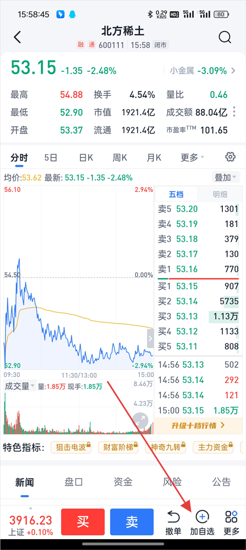 4、找到目标股票后,点击底部的【加自选】按钮即可成功添加。