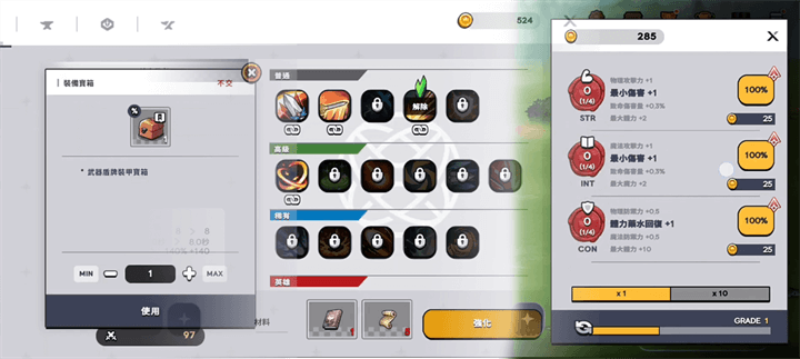 ②装备:战斗掉落金币的同时,也会掉落装备宝箱,也可以透过完成主线与支线任务获得装备宝箱,更好的装备可以进一步提升玩家的属性,利用锻造锤还可以强化装备属性。