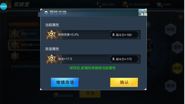 如果玩家们如果不满意解锁出来的属性,可以通过用科技核心和金币进行属性的变换,直到更换到玩家喜欢的属性为止。