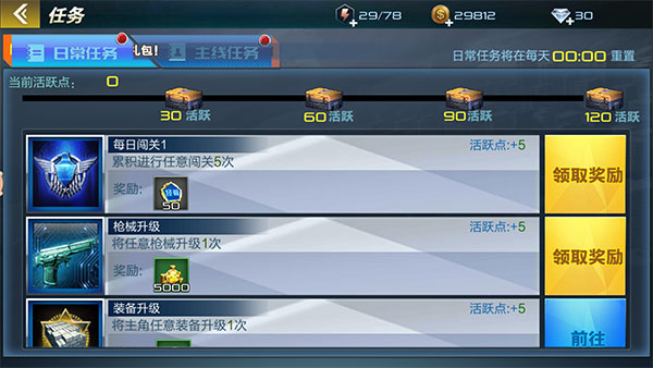 任务分为日常任务和主线任务,完成不同的任务可以获得不同的奖励,其中包括一些升级资源的奖励。