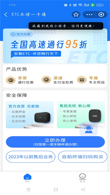 安徽ETC APP是一个专为安徽高速公路ETC徽通卡设计的便捷工具。它提供了一系列车主服务,包括优惠办理、车务管理、违章提醒和年检代办等。用户还能在线充值、查询账单,并查看实时路况和通知公告等信息。