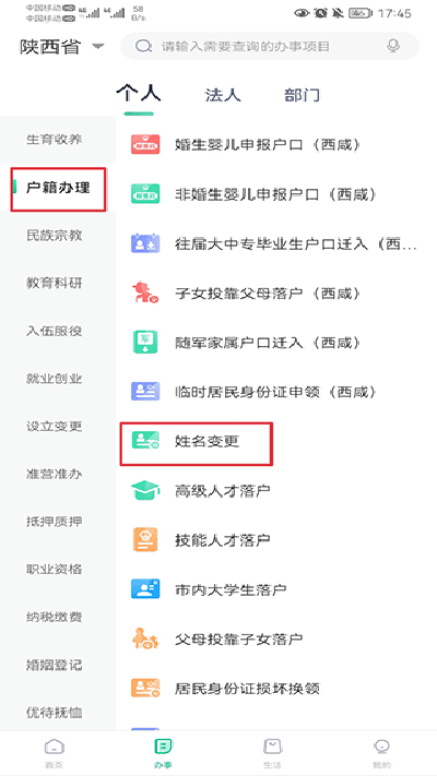 1、打开陕西政务服务平台,在下方办事中的户籍办理找到姓名变更;
