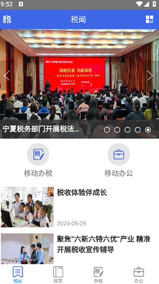 展示宁夏税务部门的工作动态,如深入企业开展合规经营宣传辅导、推动【高效办成一件事】落实落地等新闻,让用户及时了解税务部门的服务举措。