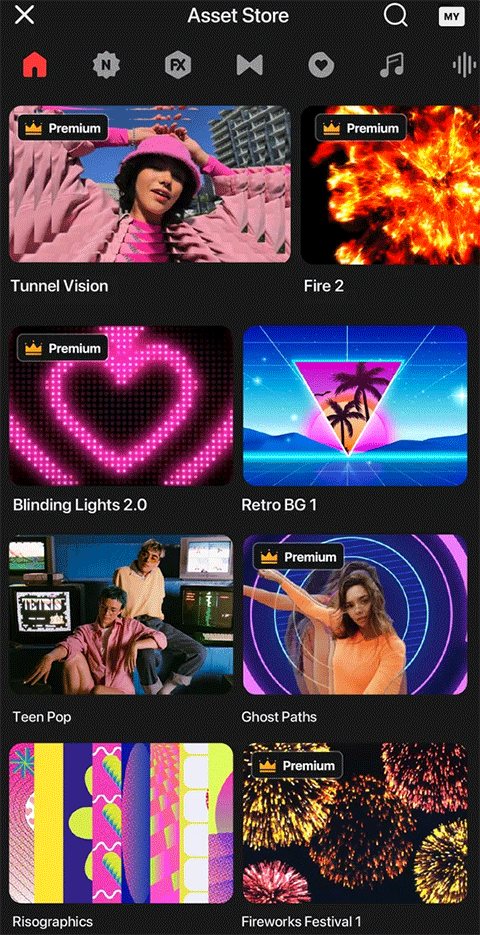KineMaster 素材商店拥有数以万计的资源,让你的视频更精彩!特效、贴纸、音乐、字体、转场和 VFX,应有尽有。