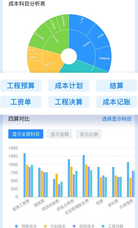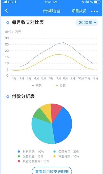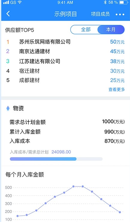 4、智能数据统计分析:乐建宝以项目为单位,将各业务条线数据进行多维度统计,事前计划、事中控制,决策分析省成本