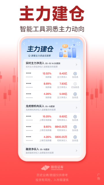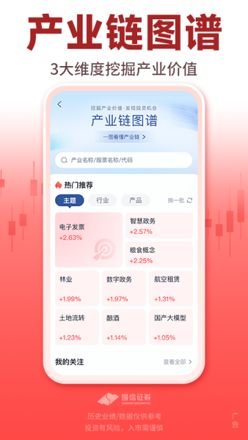重新布局突出资产显示,打造类似“申购宝”、“国债逆回购”等场景型交易产品,提供智能选股盯盘、产业链图谱、形态选股、筹码分布、估值分析等智能化工具,助您便捷的使用交易功能。