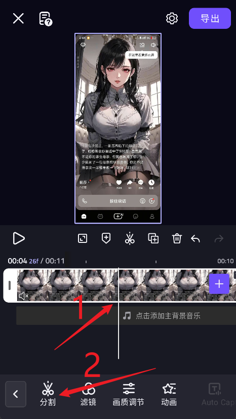 3、如图所示将白线拖动到你需要截取的位置后,点击下方的分割。