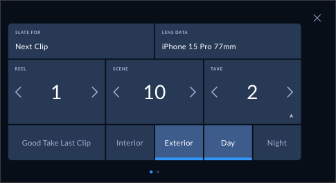 元数据能简化后期制作中素材的分类与处理流程。通过片场板功能,您可添加镜头类型、项目名称等附加信息。左右滑动即可切换页面。