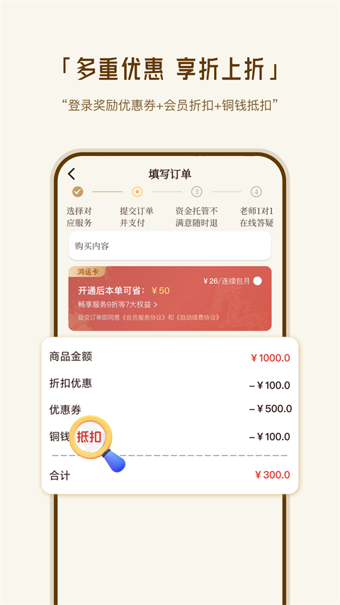 “登录奖励优惠券+会员折扣+铜钱抵扣”
