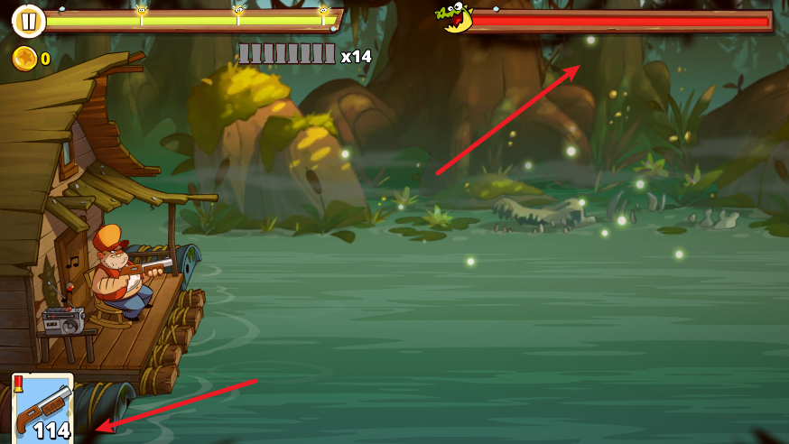 游戏的操作简单易上手,适合新手和老玩家。进入游戏后可以选择跳过剧情直接开始闯关。在对战中,玩家需要乘坐竹筏,时刻警惕河道中的鳄鱼袭击,并及时使用武器将其击退。同时,关注右上角的进度条和左下角的子弹数量是提升战斗效率的关键。