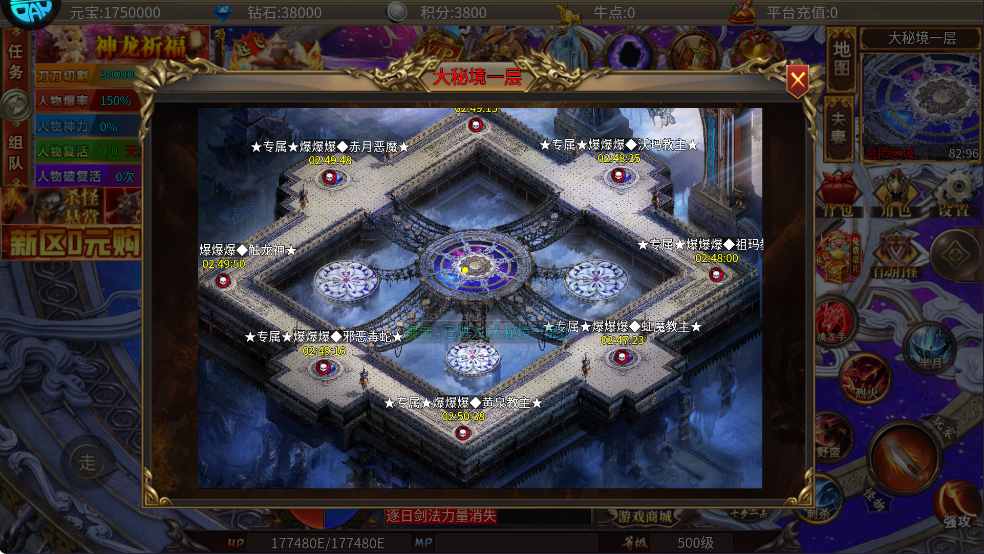 玩法介绍:全服BOSS地图,每层有八只,一共有5层,BOSS可爆专属装备和合成神器必须的大秘境结晶!