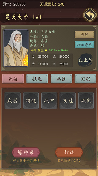 6、强者这里玩法也较多,如打造装备,其中打造装备的等级与强者等级相同,打造装备的品质靠天工锤决定。需要注意的是”爆神装“操作尽量不要太早进行,最快也是登菩提树9级时,将上阵强者升到9级,再使用”爆神装“功能,开局会奖励几枚”神话装备种子“,谨慎使用!