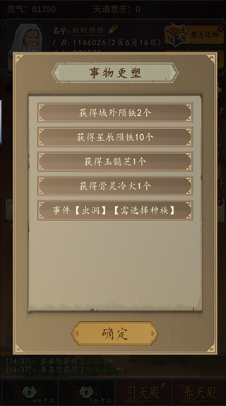 3、世界1级的缔造次数用到上限后再点击世界升级,2级解锁”事物更塑“,这个操作也是基础操作,每次会产出大量材料,以及触发事件,事件中会有好的事件、坏的事件,要在30分钟内”天道事件“界面及时处理。此操作也有世界次数上限,务必用完后再升级!