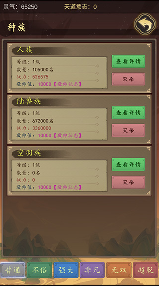 5、升到5级后,可查看强者,可在种族界面,点击人族,查看人族详情,点化强者,人族是唯一不需要天道意志的可进行点化的强者!强者很重要的,没有强者不可进行战斗!