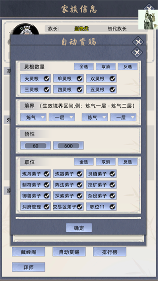 例如:炼丹30以上的弟子设置后加入家族时可自动分配为炼丹弟子。各方面都十分差的弟子设置后可以自动分配为杂役。优点:在飪彩葒鱉爽蔡息口极多的情况下可以快速寻找到需要的精英弟子。
