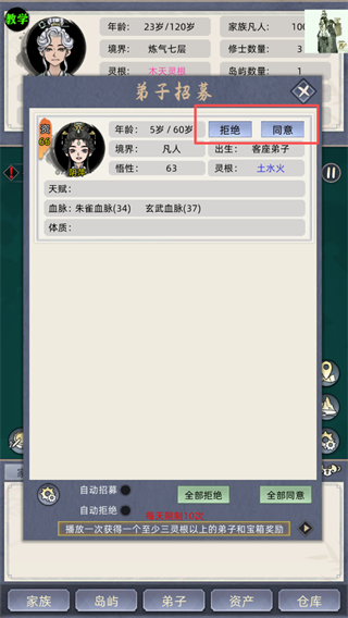 在海域/大陆界面打开,升仙大会招收的是客座弟子,族内检测招收的是家族弟子,当弟子满足勾选的任意条件后便可以自动招募进家族,否则会留存在招募页面,在这里也可以设置自动关注新招弟子与否。自动拒绝,会拒绝掉所有未被招募的弟子,打开后招募界面不会留存任何弟子筛选招募的优点:不会参杂负面天赋和稀薄血脉(例如只接收单灵根弟子,其他多灵根弟子就不会自动加入家族,族长可以进行筛选决定去留)