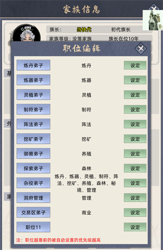 在基地内可以打开工作界面,这里可以编辑弟子的职位,根据弟子的各项能力进行职位分配。