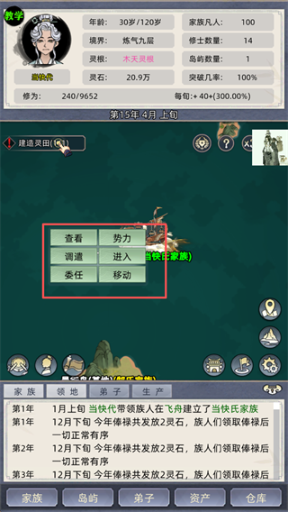 随着游戏深入,你需要合理安排族人的工作,比如挖矿、种植灵田或探索新岛屿。探索过程中可以收集资源,同时需要警惕其他修仙家族的威胁。通过提升家族实力,逐步收复被占领的岛屿,实现霸业。