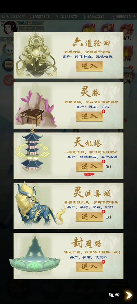 ③试炼古路:类似爬塔,可以获得极品灵石、丹药、法宝以及弟子,不能重复获取。