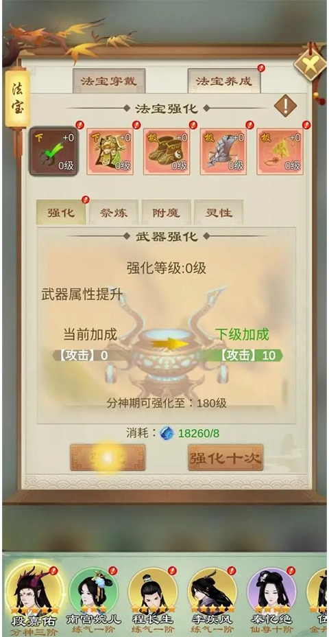 强化主要强化法宝的主要属性(一条),比如说武器就强化攻击、鞋子就强化闪避等等;