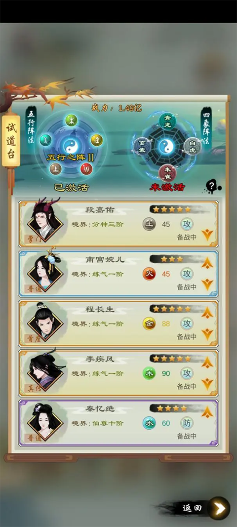 根据上阵弟子的五行属相能够形成不同的阵法,其中门槛最低也是大家初期最好组的就是五行之阵了,不过相应的提升也比较有限,随着弟子的增多后续也会根据使用场景替换。