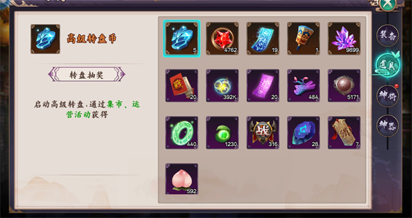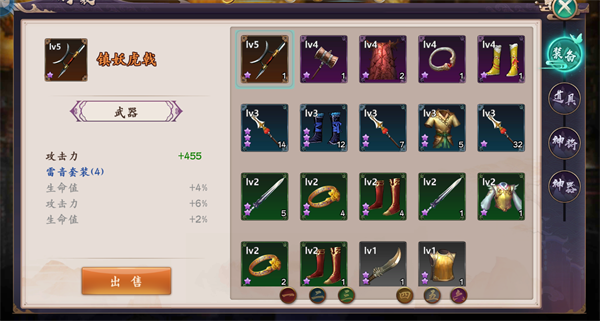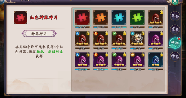 【行囊】系统分为:装备、道具、神将、神器四项存储栏。