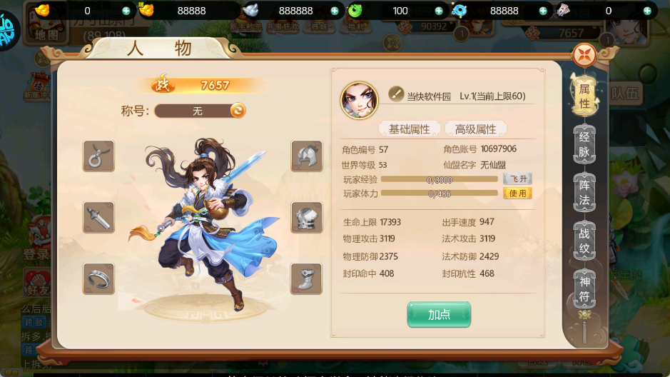 4、创角送财富锦囊:充值卡*648元,仙玉*88888、银元*888888、绑元*88888!