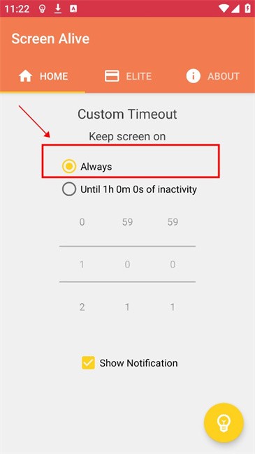 3、打开灯泡后选择“Always”始终(保持屏幕打开状态)。完成上述操作后,重启手机后也是一直亮屏状态,除非你在系统设置中选择自动锁屏时间。