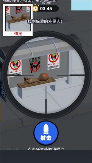 《狙击外星人》是一款考验眼力的射击游戏,玩家需要在限定时间内找到隐藏在场景中的外星人,体验感十足。游戏中,外星人会变色、模仿人类动作,甚至躲藏在人群中或障碍物后,增加了挑战性。没找到时还能用免费道具快速定位。场景丰富,从商业街到太空基地,天气变化也会影响视线。