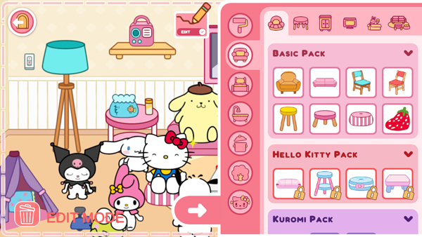 在 Hello Kitty 和朋友们的世界里,你可以建造和装饰各种主题房屋,比如 Hello Kitty 的家、酷洛米的家、布丁狗的家……甚至是充满节日气氛的圣诞节小屋或惊悚刺激的万圣节小屋——随心所欲地搭配组合!