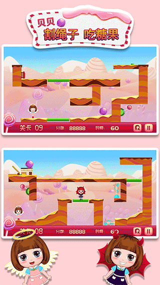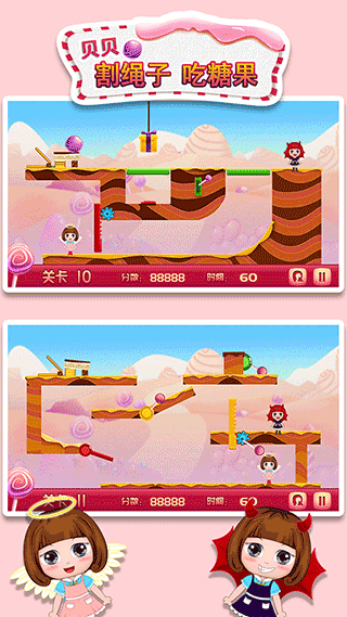 1、休闲玩法——通过拨动开关,割断绳子,让天使贝贝吃到糖果,锻炼小孩子的智力、思维能力。