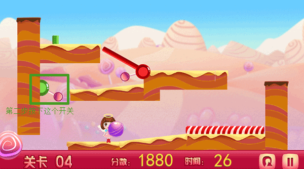 1、简单的玩法,小朋友在割绳子之前要想一下能否吃到糖果,否则是吃不到糖果的哦,至关重要的一步,需要孩子们认真思考,平常也可以多训练一下儿童思维、思考能力、判断力、物理知识和动脑能力,如果你决定好了那就拖动机关吧,让滚球形状的糖果翻滚下来,如果你成功了,就一定能吃到甜甜的糖果。