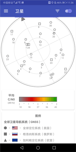 2、当小编我跑到室外时,就可以看到头顶上的天空的卫星,用户可以发现app的圆盘上的所有检测到的卫星都有了颜色,其中五边形的就是中国北斗卫星