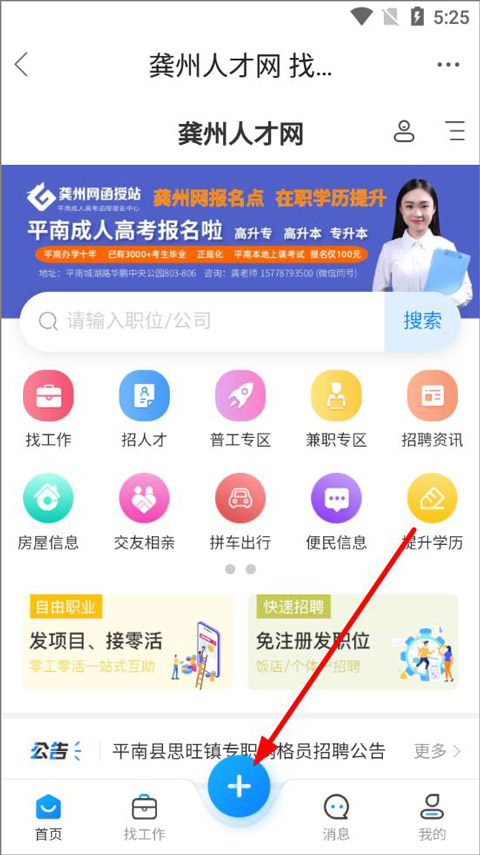 2、进入求职招聘页面,有找工作、招人才、普工专区、兼职专区、招聘咨询等,点击下方“+”;