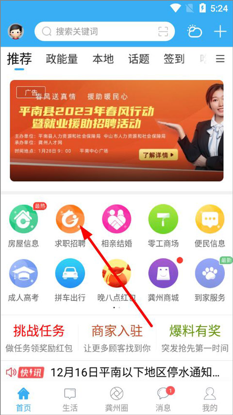1、打开龚州网app,进入首页,首页可查看房屋信息、本地话题、相亲结婚、成人高考等信息,点击求职招聘;